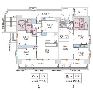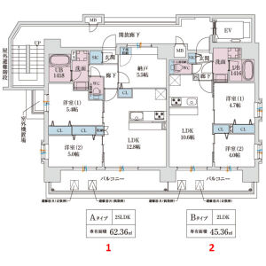 | 402 (4階部分) | 2LDK (45.36m2) | ||||