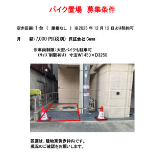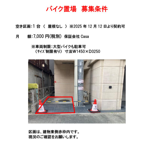 敷地内駐車場/空きなし バイク置き場1台空き有 月額7,000円税別 大型バイク可 |