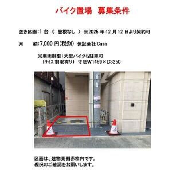敷地内駐車場/空きなし バイク置き場1台空き有 月額7,000円税別 大型バイク可 |
