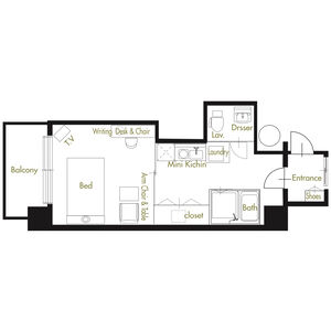 家具、家電付(液晶テレビ・電子レンジ・冷蔵庫・洗濯機・乾燥機・ホテル仕様ベッド・ライティングデスク・アームチェア・テーブル)