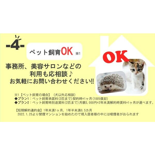 【ペット飼育の場合】●プラン1:ペット飼育承諾料(2匹まで)契約時+1ヶ月(100%償却)●プラン2:ペット飼育時別途賃料(2匹まで)月額3,000円+2年未満解約時賃料+1ヶ月が選べます。※ペットは犬以外相談可能
