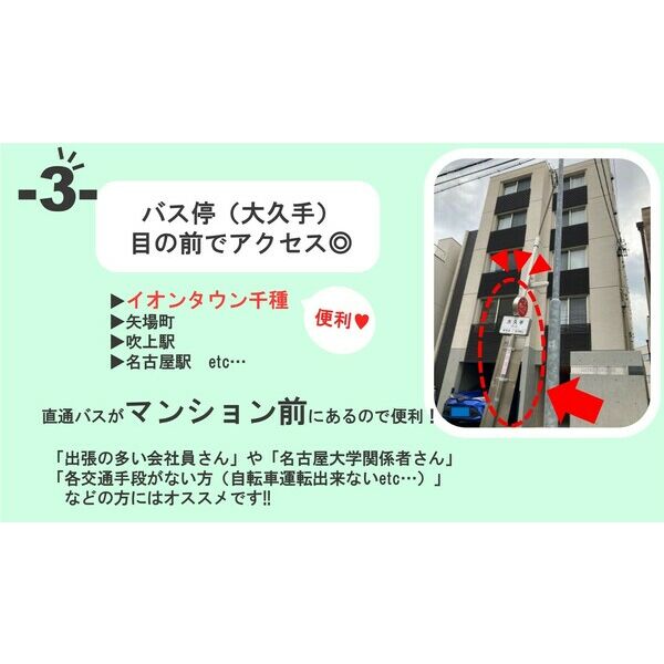 イオンタウン千種・矢場町・吹上駅・名古屋駅直通のバスがマンション前にあるので便利!