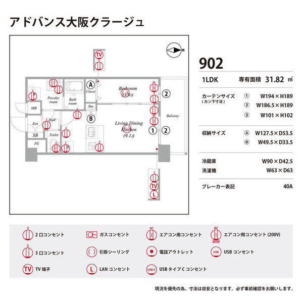 | 0902 (9階部分) | 1LDK (31.82m2) | ||||
