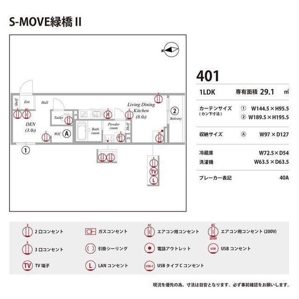 | 0401 (4階部分) | 1LDK (29.1m2) | ||||