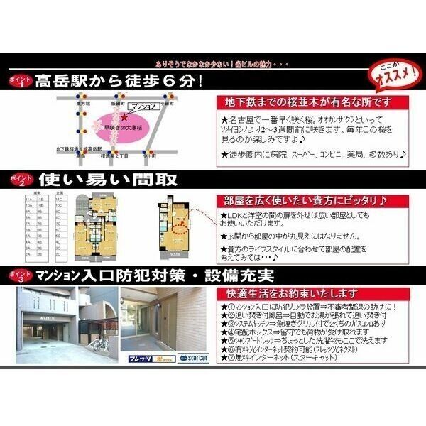 高岳駅から北へ徒歩6分、設備充実のマンション。買い物施設多数・クリーニング店・コンビニがあり住みやすい街です。共用部清掃は1週間に2回入っており比較的清潔に保たれています。
