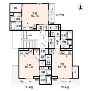 | 302 (3階部分) | ワンルーム (27m2) | ||||