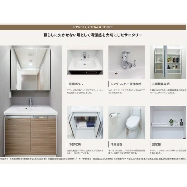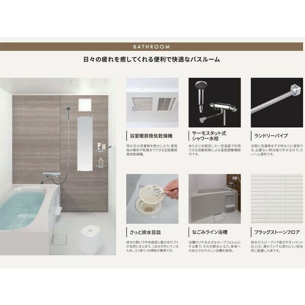 | 水廻り | ○ 風呂 ○ トイレ(水洗) ○ 洗面台(独立) ○ 浴室乾燥機 ○ 暖房便座 ○ シャワートイレ ○ バス・トイレ別 ○ 洗濯機置場(室内) |