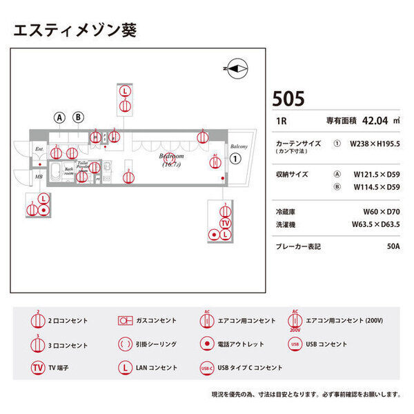 | 0505 (5階部分) | ワンルーム (42.04m2) | ||||